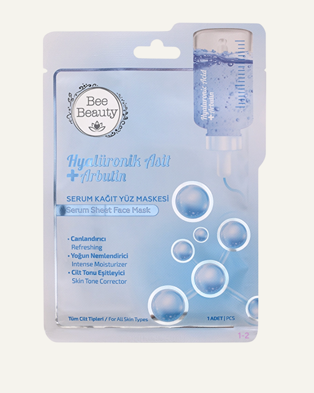 • Le masque en tissu imbibé de sérum Bee Beauty, enrichi en acide hyaluronique et en arbutine, aide à prévenir les irrégularités de teint et à unifier la peau.