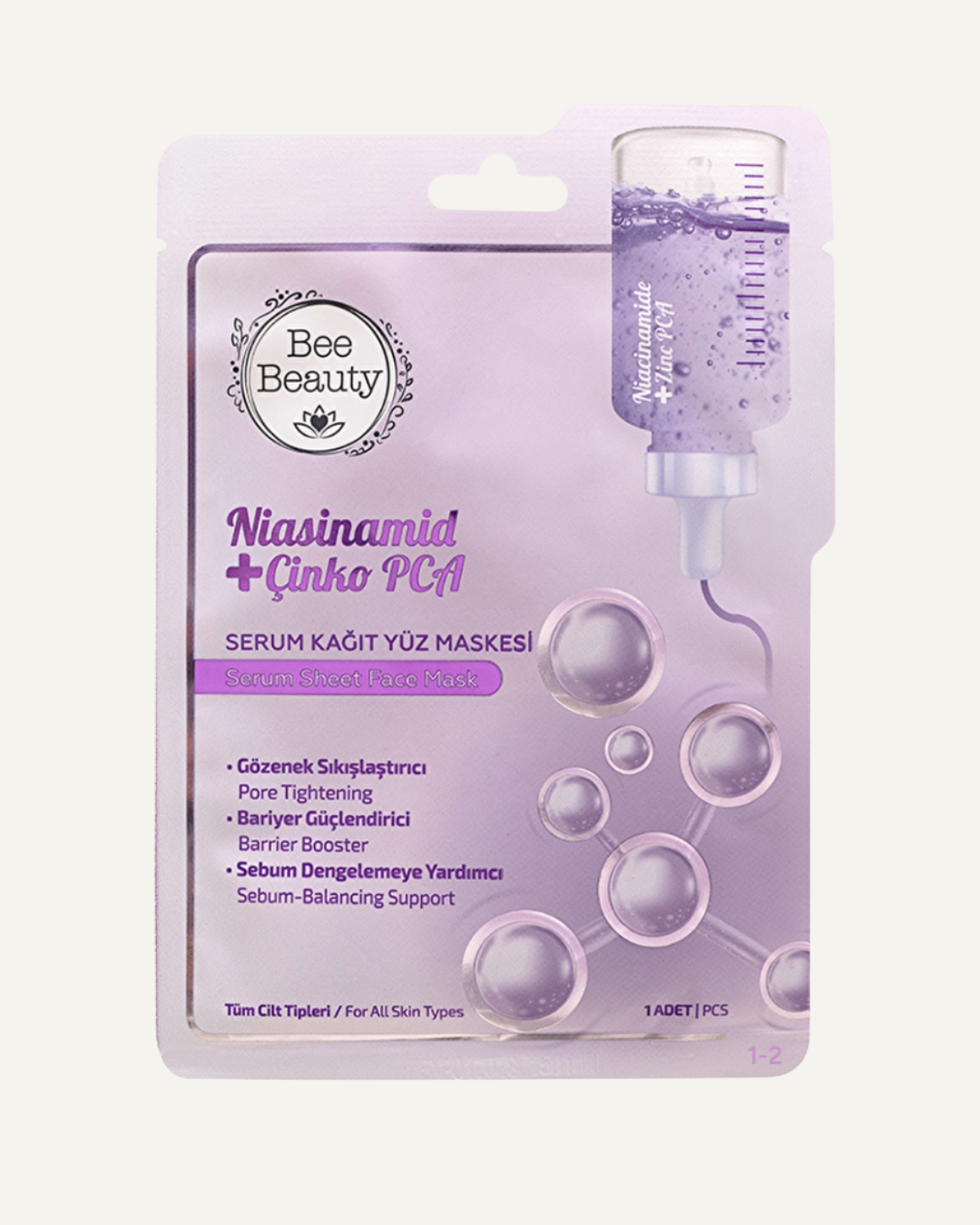 • Le masque en tissu imbibé de sérum Bee Beauty, enrichi en niacinamide et en Zinc PCA, aide à renforcer la barrière cutanée et à maintenir l’équilibre du sébum de la peau.